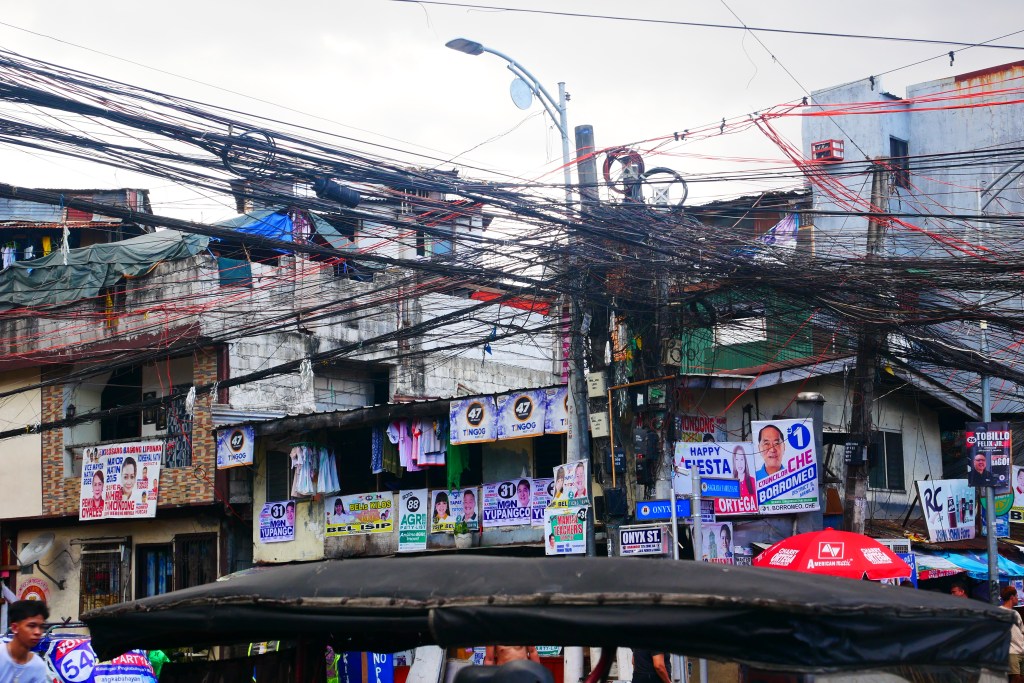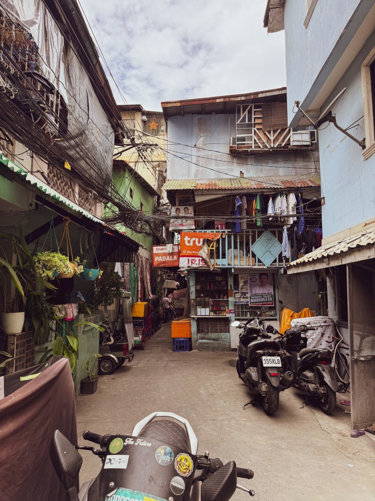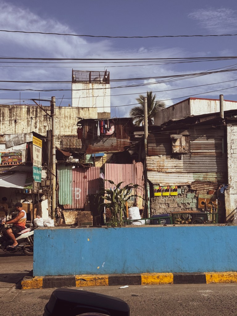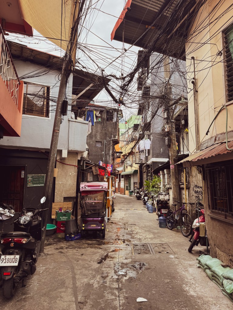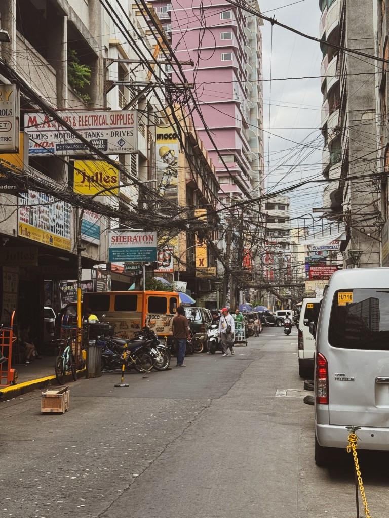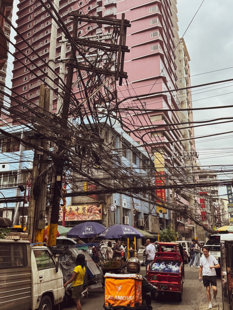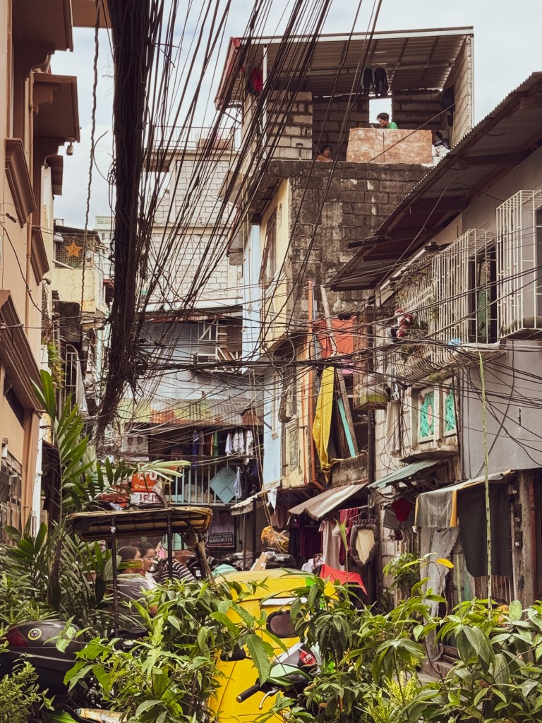 Le lendemain, Dawson m’a donné une liste de quartiers à explorer, et j’ai commencé par le Chinatown. Dès que je suis arrivée, j’ai su que j’allais aimer cet endroit. C’était un terrain de jeu parfait pour la photographie. Les rues étaient bondées, les fils électriques formaient un enchevêtrement au-dessus de ma tête, les jeepneys colorés klaxonnaient, les odeurs de nourriture se mélangeaient à celles de la pollution. Les maisons semblaient parfois tenir debout par miracle, construites avec de la tôle, du bois, du carton. C’était bruyant, désordonné, intense… et incroyablement vivant.