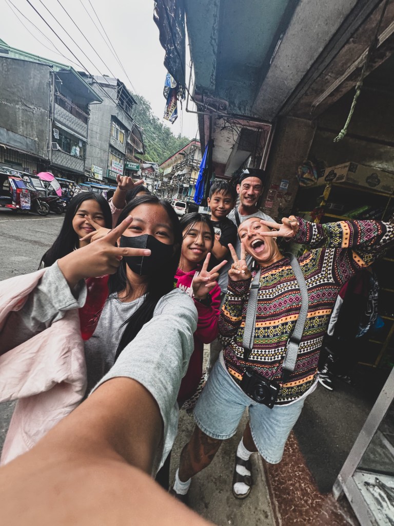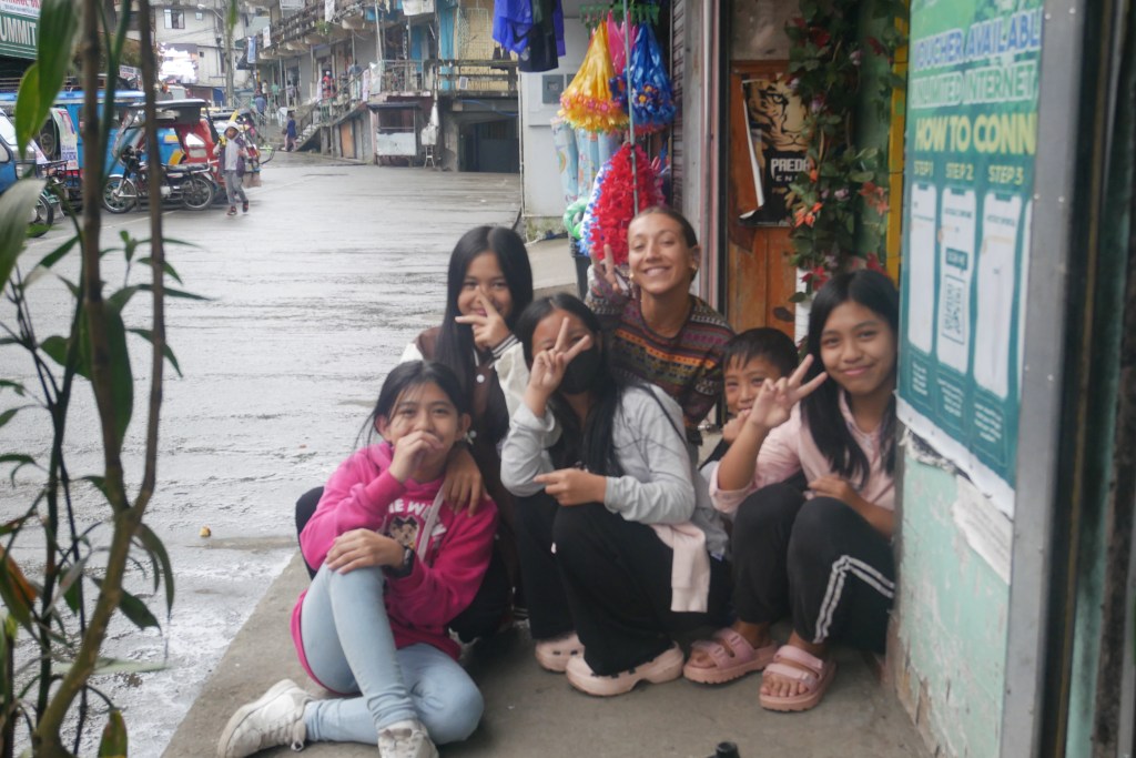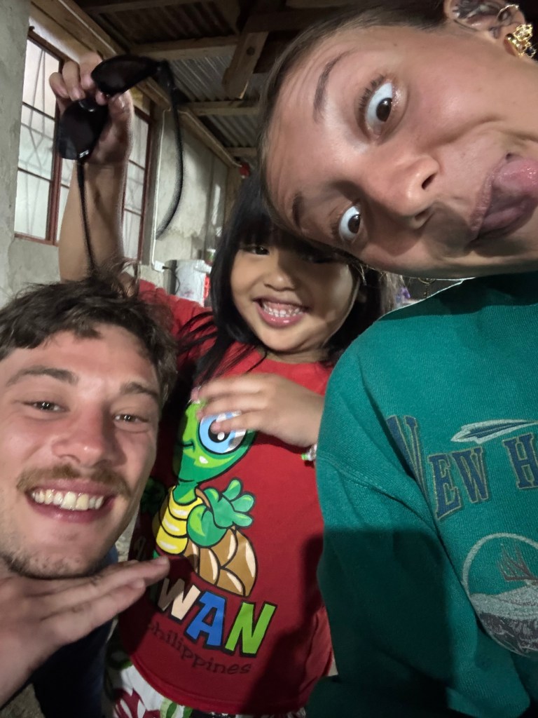 En après-midi, on s’est assis devant un petit magasin pour grignoter des snacks philippins — des chips sucrées, des biscuits fluorescents, des trucs impossibles à identifier. C’est là qu’un groupe d’adolescents est venu nous voir. Au début, c’était des regards timides, des rires étouffés, puis un “hello” lancé du bout des lèvres. Une heure plus tard, on était tous assis ensemble sur le trottoir, à discuter comme si on se connaissait depuis toujours. Ils nous parlaient de leur école, de leurs rêves de partir un jour à Manille, ou même à l’étranger. Nous, on leur racontait le Québec, la neige, le froid qu’ils n’arrivaient même pas à imaginer. Quentin leur a offert des boissons, et leur excitation était digne d’un Noël improvisé. Une petite fille m’a dit qu’elle trouvait mon collier beau. Je le lui ai donné, et son sourire, à ce moment-là, valait tous les souvenirs du monde.