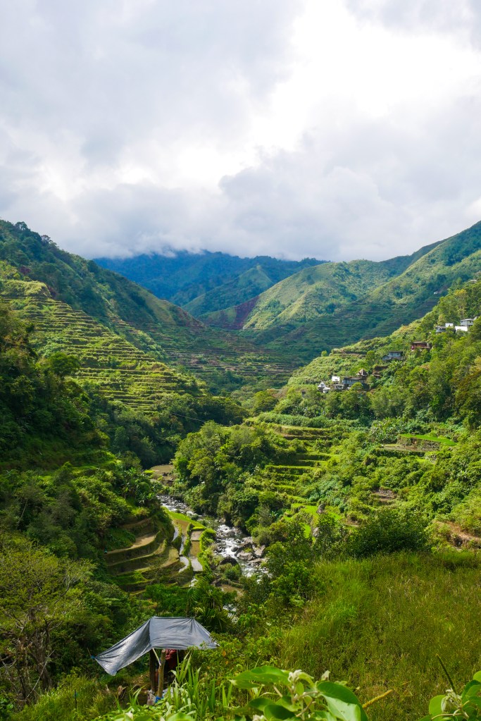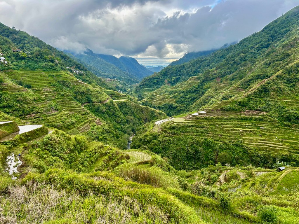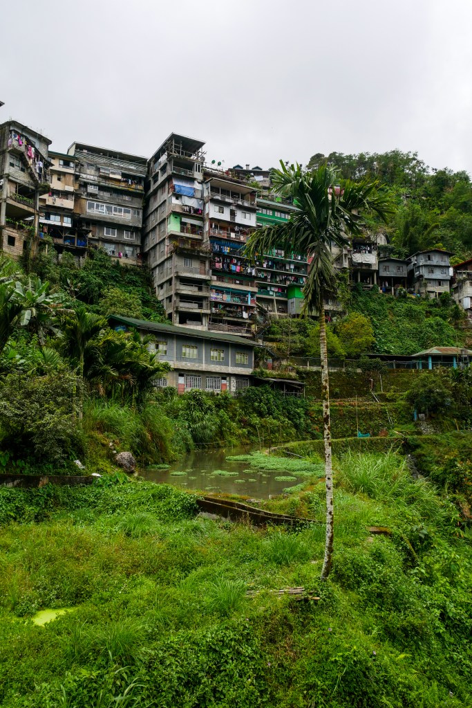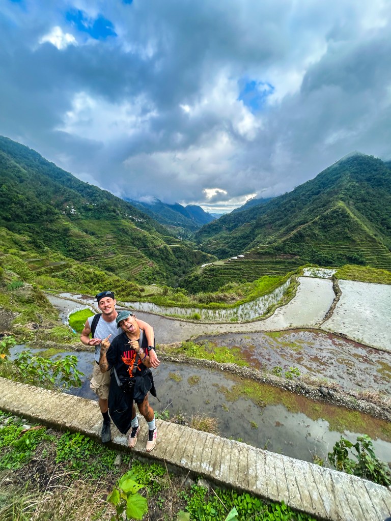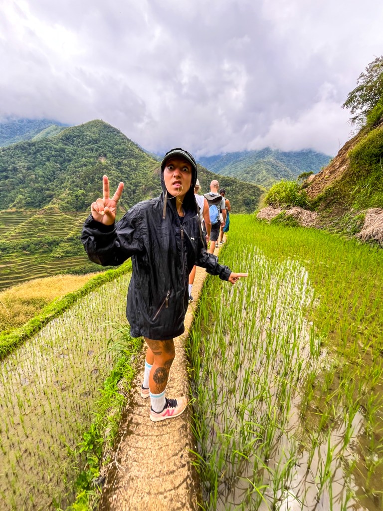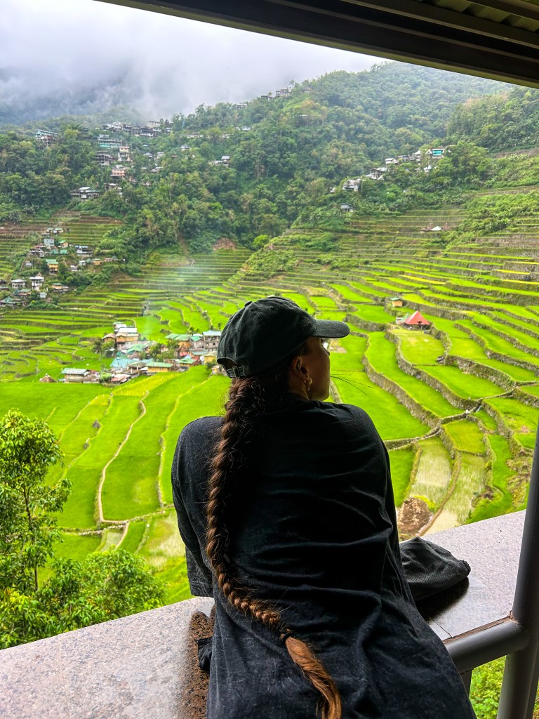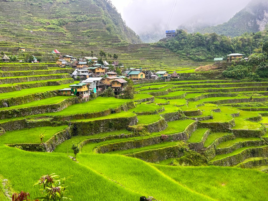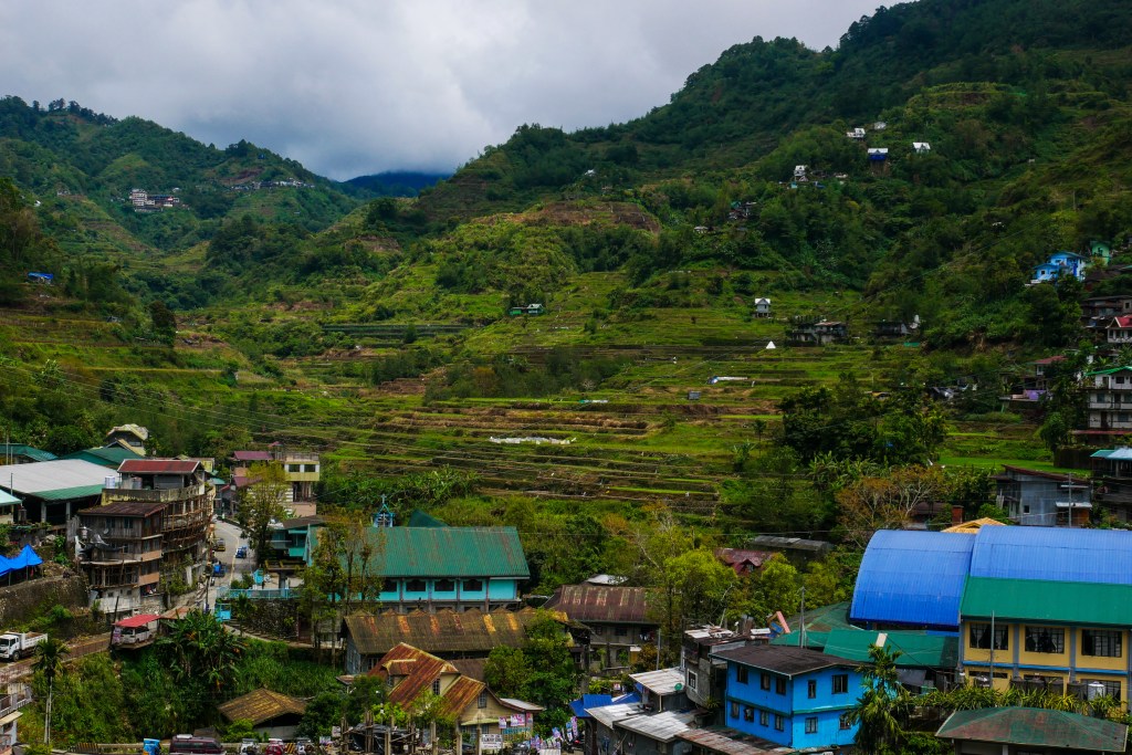 Notre première journée à Banaue s’est passée sans sac à dos ni bâtons de marche, juste avec nos yeux grands ouverts. Le village est littéralement accroché à la montagne, des maisons en bois et en tôle empilées les unes au-dessus des autres, reliées par des escaliers et des routes étroites. Et autour, à perte de vue, les rizières en terrasses. Elles ne sont pas simplement belles : elles sont impressionnantes. On a l’impression que quelqu’un a sculpté la montagne avec une précision d’orfèvre, dessinant des courbes parfaites qui suivent le relief comme des vagues figées.