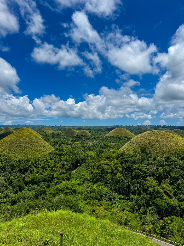 Le lendemain matin, direction Carmen, le cœur de l’île, pour voir les célèbres Chocolate Hills. Pour s’y rendre, on a pris ces fameuses petites vans locales — je ne me souviens plus du prix exact, mais c’était vraiment pas cher. Par contre, le confort… on repassera. Imaginez : 10 places prévues, 16 personnes à bord, des sacs, des genoux dans le dos, et zéro espace personnel. On était entassés comme des sardines, mais tout le monde trouvait ça normal. Bienvenue dans les transports philippins.