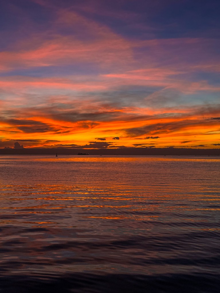 Sur le bateau, on a eu droit à un magnifique coucher de soleil. Le ciel s’embrasait doucement pendant que le ferry avançait sur une mer presque immobile. Après toute cette journée de stress et de transport, ce moment-là avait quelque chose de très apaisant, comme une récompense.
