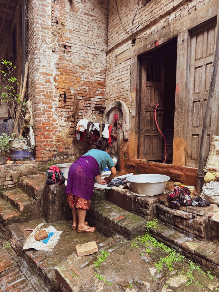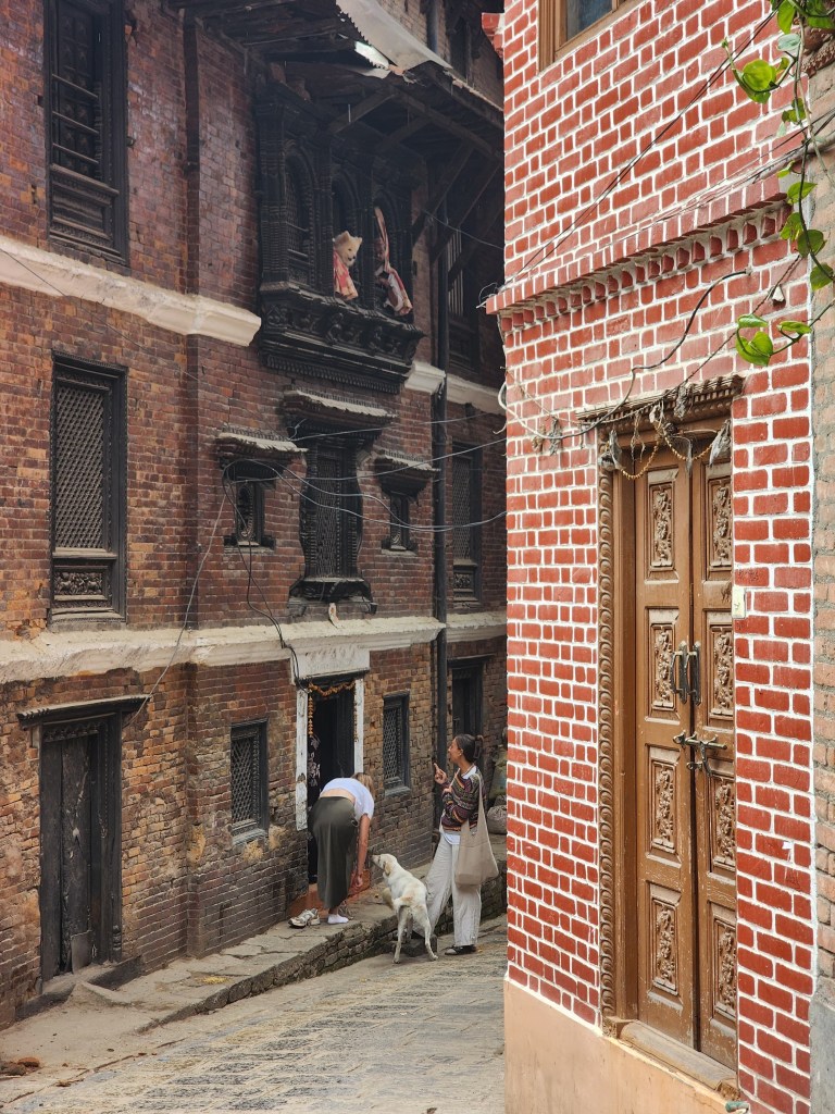 Le moment le plus marquant, pourtant, a été cette invitation inattendue. Un couple de locaux nous a proposé de visiter leur maison. On a enlevé nos chaussures à l’entrée et on a grimpé par un escalier étroit, aux marches usées par des années de passages. À l’intérieur, la maison était simple mais chaleureuse : des murs en brique apparente, des pièces petites mais bien organisées, et souvent un petit autel familial décoré de fleurs, d’encens et d’images de divinités hindoues. Voir l’intérieur d’une maison newari, loin des hôtels et des restaurants, c’était comme passer de l’autre côté du décor, découvrir la vraie vie derrière les façades historiques.