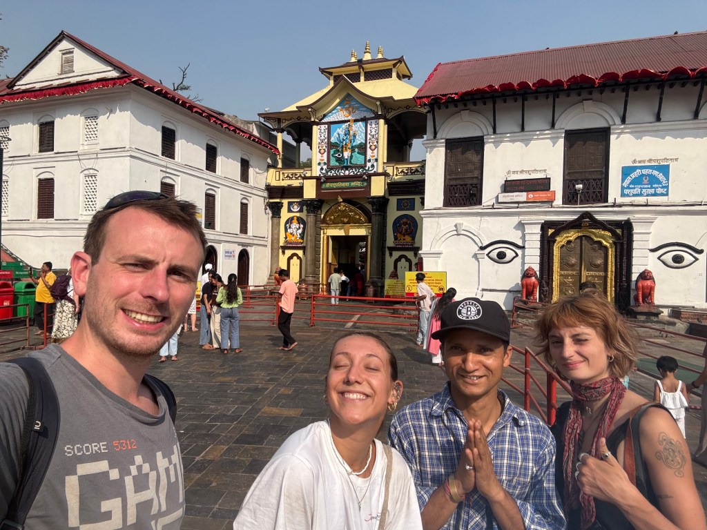 Notre première grande sortie a été la visite du temple de Pashupatinath, et j’y suis allée avec Sayanne, Benjamin et le local qui m’avait donné mon cours de yoga le matin même. C’était assez drôle comme situation : quelques heures plus tôt, j’étais allongée sur un tapis à essayer de respirer correctement, et là, j’étais en train de suivre ce même gars à travers l’un des lieux les plus sacrés du Népal, comme si j’avais engagé un guide spirituel à temps plein sans le savoir.