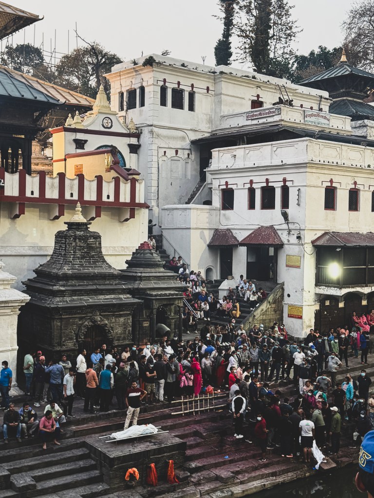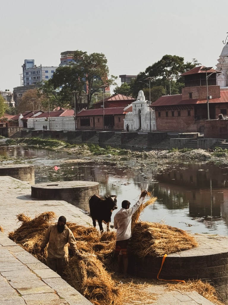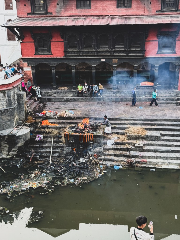 Notre ami nous a expliqué que la rivière Bagmati est considérée comme sacrée, car elle rejoint le Gange en Inde, lui aussi sacré. Être incinéré sur ses rives est donc vu comme une bénédiction, un moyen de rapprocher l’âme de la libération. Les cendres sont ensuite dispersées dans l’eau, symbolisant le retour du corps aux éléments.