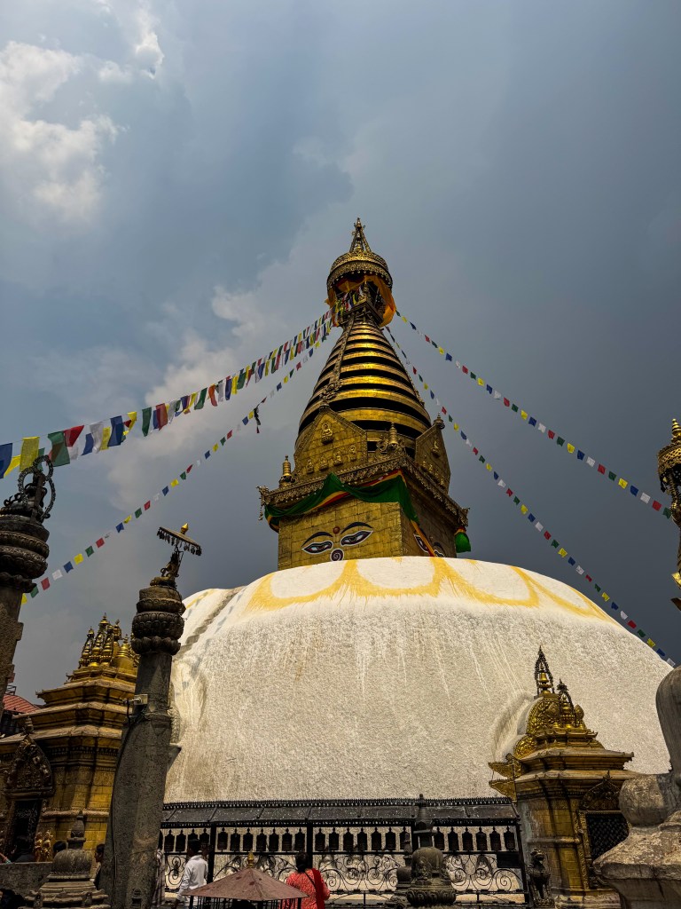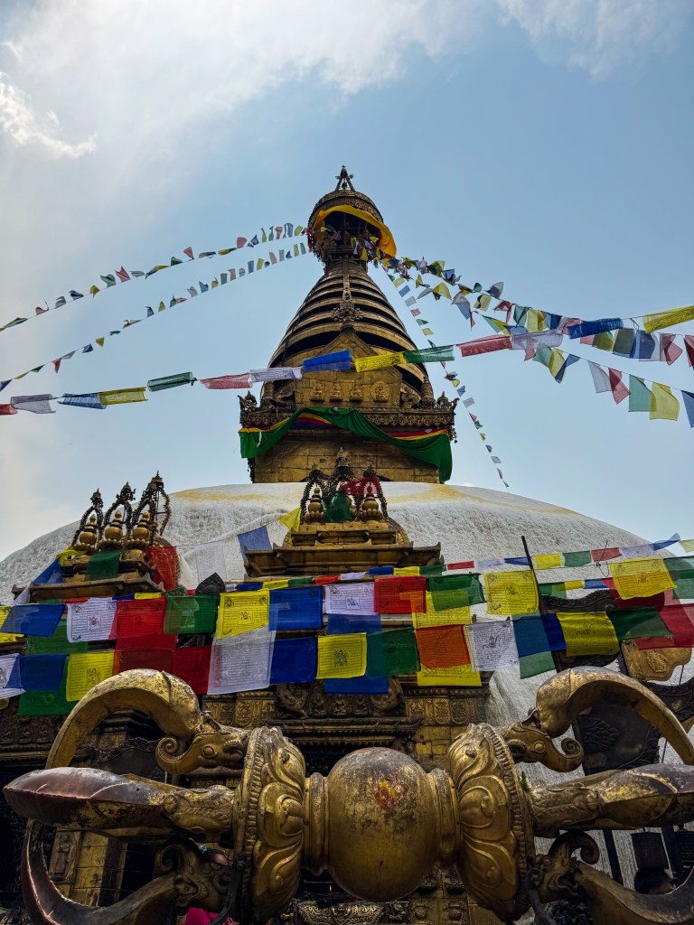 On a aussi visité Swayambhunath, le fameux temple des singes. Pour atteindre le sommet, il faut grimper des centaines de marches, entouré de drapeaux de prières qui claquent dans le vent et de singes qui te regardent comme si tu étais l’intrus. Une fois en haut, la vue sur la vallée de Katmandou était à couper le souffle. Le grand stupa blanc, avec les yeux du Bouddha peints sur chaque côté, semblait observer la ville entière avec une sagesse tranquille. J’ai tourné autour dans le sens des aiguilles d’une montre, comme le faisaient les pèlerins, en faisant tourner les moulins à prières, sans trop savoir si je le faisais bien, mais avec beaucoup de respect.