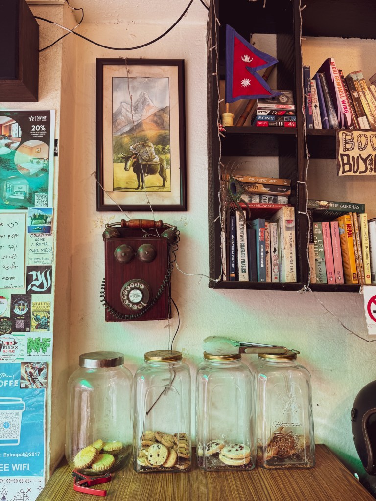 Après ça, on s’est retrouvés autour d’un café chez Mira’s Coffee, mon endroit préféré à Katmandou. Un petit café bohème, rempli de musique douce, de plantes et de voyageurs qui avaient tous l’air d’écrire soit un roman, soit des messages vocaux de cinq minutes à leur mère. Le café y était incroyablement bon, et c’est là que j’ai compris que même à des milliers de kilomètres de chez moi, une tasse chaude pouvait devenir un point d’ancrage. Le masala tea est INSANNNNNNNNNNNE !!!!! Sans oublier les pâtisseries 😉