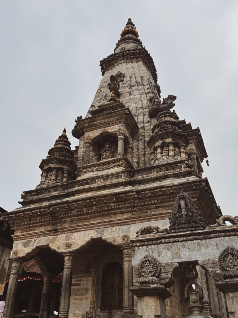 À l’entrée du sanctuaire principal, nous avons dû nous arrêter, car seuls les hindous peuvent y entrer. Notre ami népalais nous a expliqué que ce n’était pas par exclusion, mais par respect pour la pureté rituelle du lieu. Nous sommes donc restés à l’extérieur à admirer les portes dorées finement sculptées, les statues de Nandi — le taureau sacré et monture de Shiva — et les toits en pagode recouverts de cuivre et d’or, typiques de l’architecture népalaise.