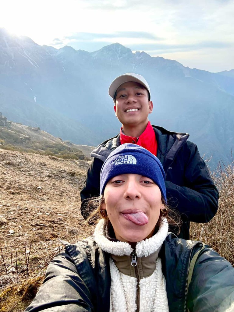 Au sommet, je rencontre Min, un Thaïlandais. On se connaît depuis genre 4 heures à peine, mais on est tellement brûlés, tellement contents d’être là, que ça clique instantanément. On commence à jaser, à rire, pis on finit par prendre des photos complètement niaiseuses ensemble. Grimaces, poses weird, petits sauts ratés… zéro sérieux. Pis c’est ça qui est le fun. Comme quoi quand tu passes à travers quelque chose de tough avec du monde, même si tu viens de les rencontrer, ça rapproche vraiment vite.