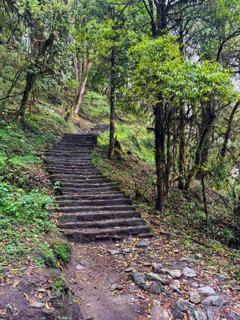 Je pars beaucoup trop confiante. Dans ma tête, c’est un trek de quelques jours, un défi le fun, quelque chose de “rough mais manageable”. Après 30 minutes, je suis déjà essoufflée solide. Pas le petit essoufflement cute, le vrai, celui où tu te demandes pourquoi t’as choisi volontairement de faire ça. Et ça commence direct avec des escaliers. Pas quelques marches… des escaliers sans fin, irréguliers, glissants, qui montent sans jamais vraiment te donner de break. Le sol est humide, l’air est lourd dans la forêt, je transpire, puis dès que le vent embarque j’ai froid. Impossible de trouver un équilibre, t’es soit trop chaude soit trop gelée.