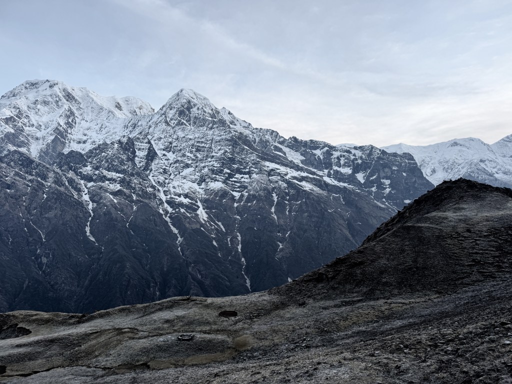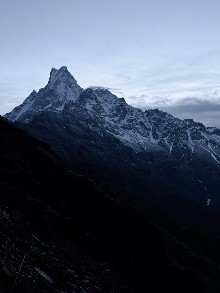 Les montagnes sont là, complètement dégagées, enneigées, énormes. Le Machapuchare est juste devant, massif, vraiment impressionnant. T’as l’impression qu’il est proche, mais en même temps tu réalises à quel point tout est immense autour de toi. Y’a presque pas de bruit, juste le vent. C’est calme, mais pas vide. Juste… apaisant.