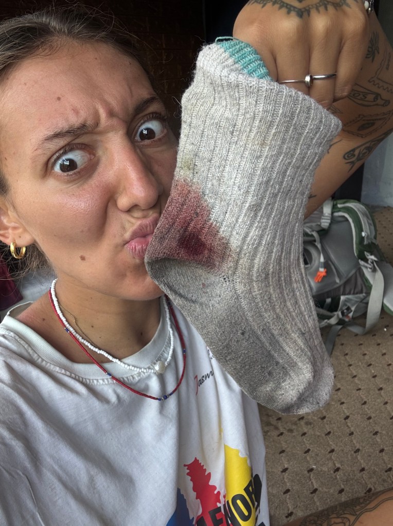 Mes genoux ont pris cher. Chaque pas en descendant, c’est un impact. Pis après les jours d’avant, ton corps est déjà fatigué. Mes pieds aussi étaient en mauvais état. Cloques, douleurs, rien de confortable. Chaque pas devient une mini négociation avec toi-même.