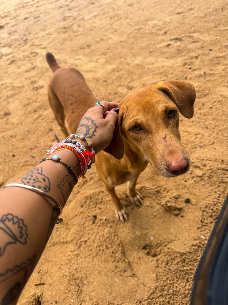 Après avoir marché un bon moment sur la plage, on tombe sur un petit café directement sur le sable, avec vue sur l’océan. Ambiance chill, prix vraiment pas chers — ce qui devient un critère important quand tu réalises que trouver un repas en bas de 1000 roupies, c’est presque un luxe ici. On s’installe, et là, évidemment, un petit chien trop mignon décide de devenir mon nouveau meilleur ami. Il reste collé à moi tout le long du repas, alors que Clem, lui, est en panique totale. Franchement hilarant. Entre ça, les corbeaux un peu flippants qui tournent autour, et la vue sur les vagues, c’est un moment parfait.