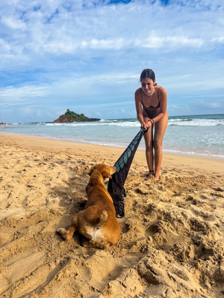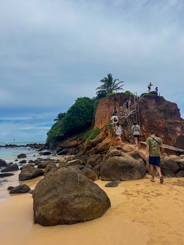 Le lendemain, slow morning comme on les aime. Moi sur le balcon avec mon ukulélé, en train de gratter quelques accords pendant que les Français dorment encore. Le genre de moment simple qui fait du bien. Ensuite, malgré une météo un peu douteuse, on décide d’aller explorer Mirissa. Parce que bon, pluie ou pas, on n’est pas venus jusqu’ici pour rester enfermés. Mirissa, c’est connu pour ses plages de rêve, ses spots de surf, ses baleines (oui, c’est un des meilleurs endroits au monde pour voir des baleines bleues), et ses couchers de soleil incroyables… mais en saison des pluies, disons que c’est une autre vibe. Moins de monde, beaucoup de restos fermés, une ambiance plus calme, presque hors du temps.