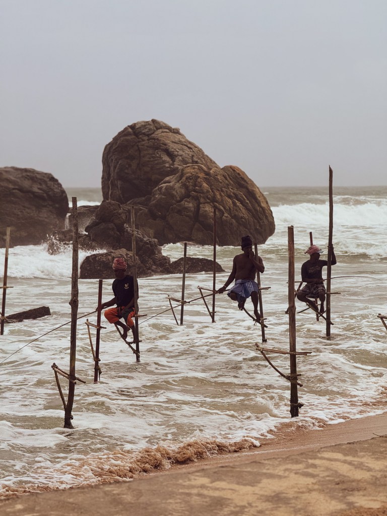 On a aussi croisé une scène assez fascinante sur la côte : des pêcheurs en train de pratiquer la fameuse pêche perchée, typique du sud du Sri Lanka. Cette technique, qu’on voit surtout autour de Galle et Weligama, consiste à s’asseoir en équilibre sur un bâton planté dans l’eau, à quelques mètres du rivage. Le pêcheur grimpe sur une petite perche horizontale, comme un siège improvisé, et reste là, suspendu au-dessus des vagues, avec sa ligne à la main. À la base, cette méthode remonte à la période après la Seconde Guerre mondiale, quand les ressources étaient limitées et que les pêcheurs devaient trouver des solutions pour continuer à pêcher sans bateaux ni équipements coûteux. C’est devenu avec le temps une image emblématique du pays, même si aujourd’hui, elle est plus rare et parfois recréée pour les visiteurs.