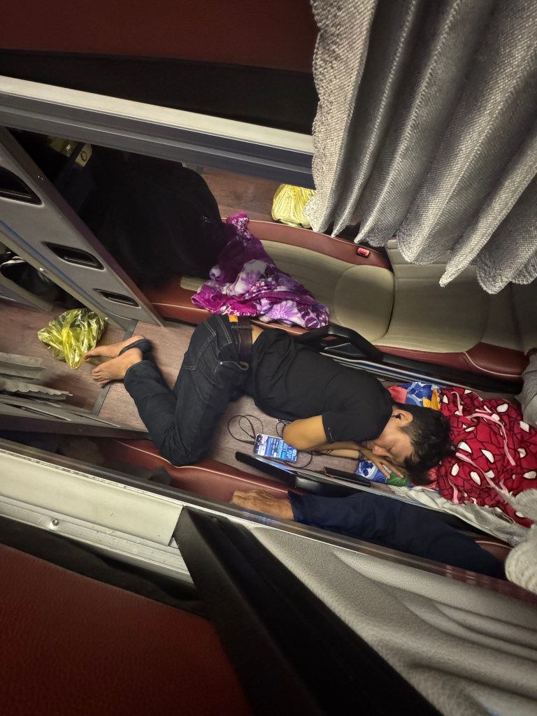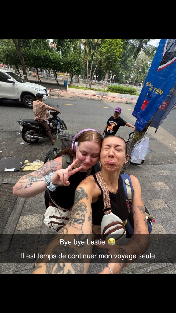 Pour faire Nha Trang → Ho Chi Minh, on a pris un bus de nuit pendant 10 heures. Petit fun fact de notre bus de nuit (parce que clairement, ce trajet-là mériterait sa propre série Netflix) : On se réveille tranquillement en plein milieu de la nuit, encore à moitié dans le sommeil, les yeux pas trop sûrs de ce qu’ils voient… et là, surprise : il y a quelqu’un couché dans le corridor du bus. Oui oui. Le corridor. Pas un siège. Pas un lit. Le corridor. À ce moment-là, tout devient clair : quand on dit que dans certains bus en Asie ils vendent plus de billets que de places… c’est pas une expression, c’est une politique officielle. On a juste regardé la scène, un peu confuses, un peu fatiguées, puis on a fini par rire. Parce qu’à ce niveau-là, t’as même plus le choix. Soit tu paniques, soit tu acceptes que tu es dans un Tetris humain en mouvement.