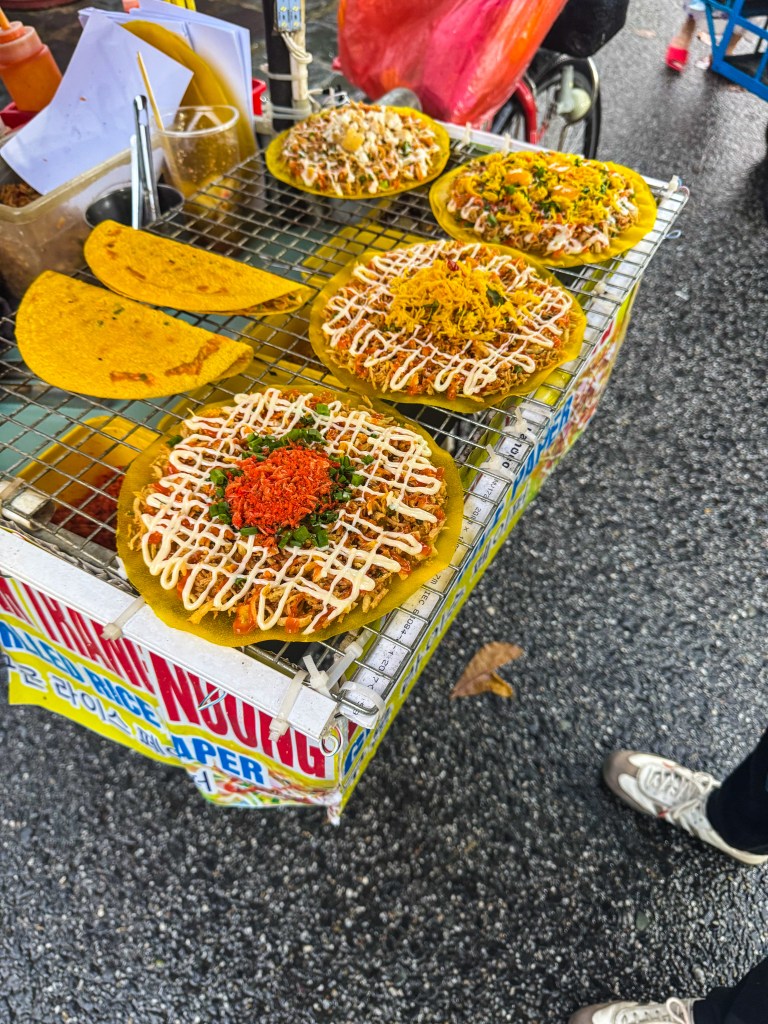 La cuisine vietnamienne nous a aussi énormément marquées, surtout le bánh mì, qui est un incontournable du pays. C’est un sandwich inspiré de la baguette française, mais revisité à la vietnamienne avec des viandes marinées, des légumes croquants, des herbes fraîches et des sauces savoureuses. Le meilleur bánh mì que j’ai mangé au Vietnam était clairement à Hội An, chez Bánh Mì Phượng. Il y a toujours une longue file d’attente, mais honnêtement ça vaut chaque minute. Ils préparent tout devant toi et il y a une énorme variété de choix. On a aussi beaucoup marché dans le Old Quarter de Hội An, avec son architecture ancienne incroyablement bien préservée. Les bâtiments jaunes, les petites ruelles étroites, les cafés et boutiques créent une atmosphère unique et intemporelle. Une journée, on a fait une grosse tournée de street food, et j’ai goûté un bánh xèo, une crêpe vietnamienne croustillante faite de farine de riz et de curcuma, garnie de crevettes, porc et pousses de soja, qu’on roule ensuite dans des feuilles de laitue avec des herbes fraîches. C’était absolument délicieux, croustillant à l’extérieur et plein de saveurs.