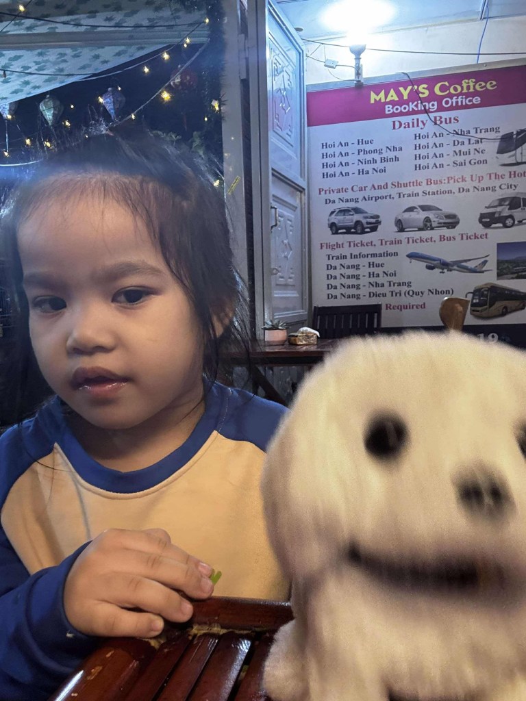 Un autre moment marquant a été notre passage dans un petit restaurant familial. C’est là qu’on a rencontré Champ An, une petite fille d’environ 5 ans. On a passé plusieurs heures dans ce restaurant à jouer avec elle, parler, rire avec elle et sa famille. Elle nous a même présenté son petit chien… et son toutou, donc officiellement deux chiens pour elle, la chanceuse.