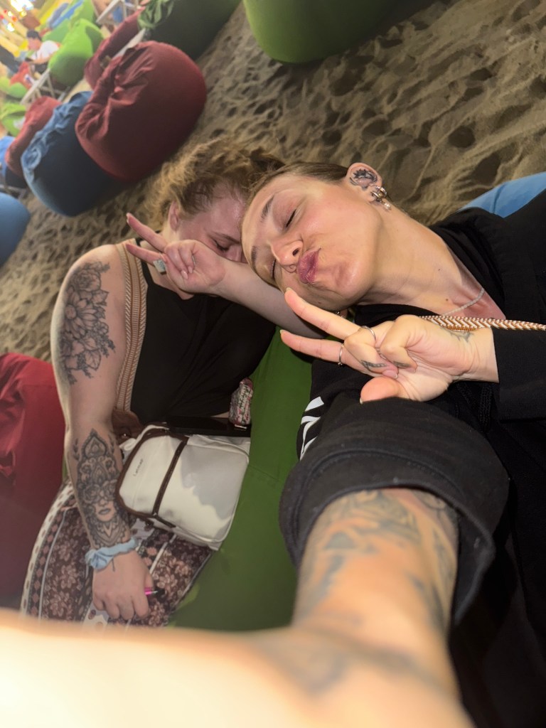 Et là, Mélodice et moi, on a eu une idée de génie (ou pas) : fake dormir pour ne pas se faire déranger. Résultat : on était couchées sur nos poufs, yeux fermés, à essayer de pas rire pendant que les gens passaient. Échec total. On a éclaté de rire. Et c’est là qu’est née notre phrase iconique :
