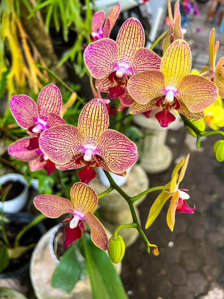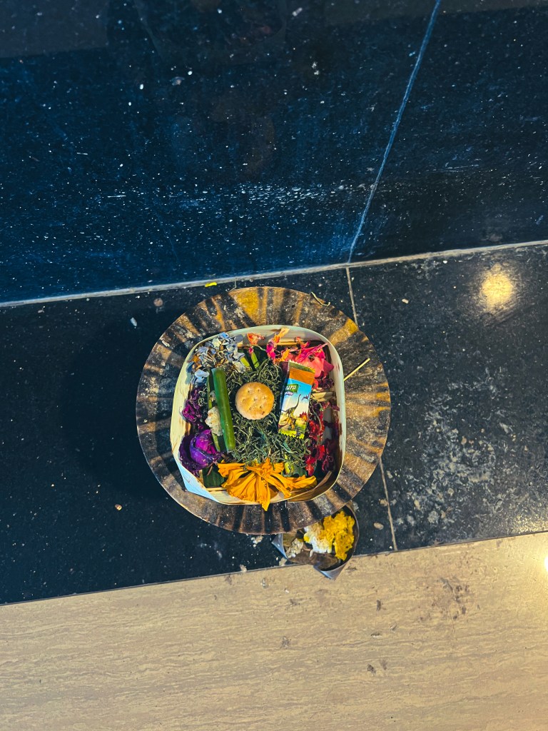 Ce qui m’a vraiment marquée, au-delà de la bouffe et du chaos, ce sont les temples. Il y en a absolument partout. Des grands, des petits, des imposants, des discrets. Chaque maison, chaque commerce a son petit autel. Et les offrandes… j’en ai vu des centaines. Des petits paniers faits à la main, remplis de fleurs, de riz, parfois même de biscuits ou de cigarettes, déposés un peu partout, même au sol, sur les trottoirs. J’ai passé tellement de temps à observer ces gestes. Il y a quelque chose de profondément apaisant là-dedans, une routine sacrée qui continue peu importe le bruit, peu importe les touristes, peu importe la vie.