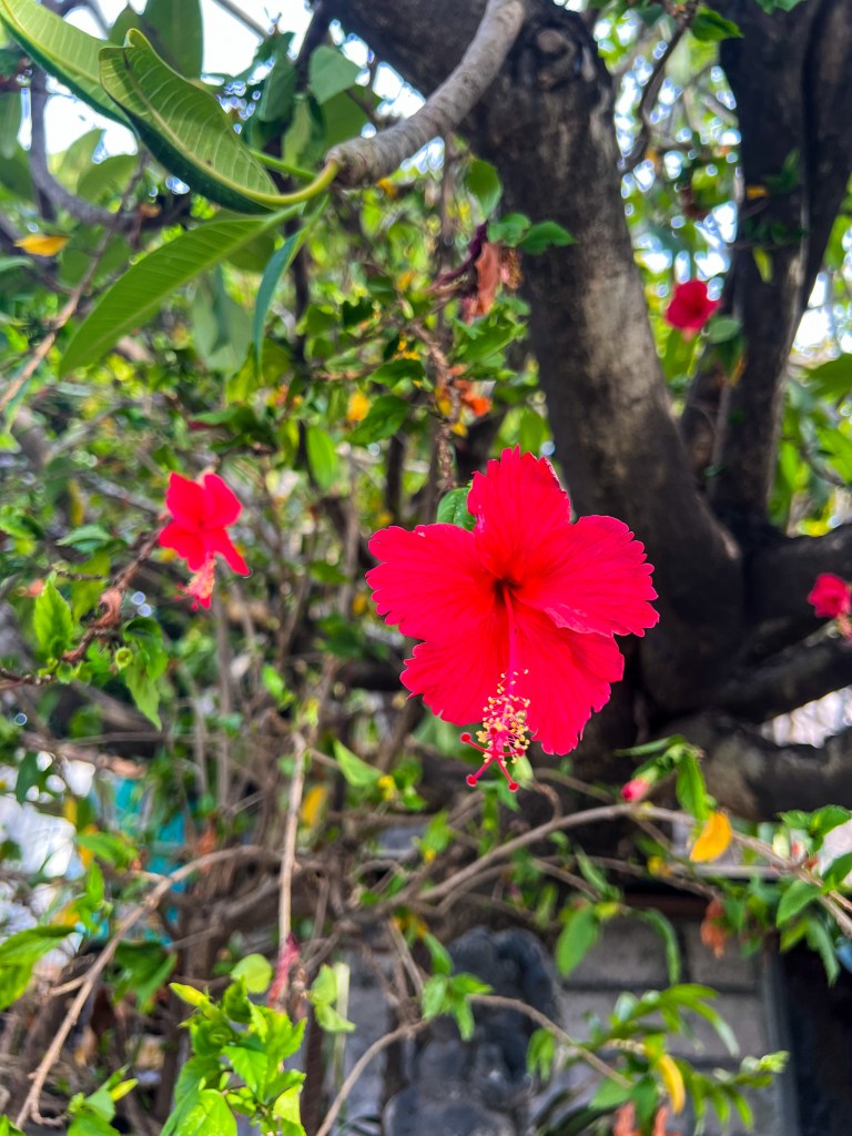 Ces offrandes, qu’on appelle canang sari, ne sont pas juste décoratives. Elles ont une signification très profonde dans la spiritualité balinaise. Chaque élément a son rôle : les fleurs représentent les différentes divinités et les directions de l’univers, le riz symbolise la vie et la gratitude, l’encens sert de lien entre le monde humain et le monde des dieux. C’est une manière de dire merci, chaque jour, pour l’équilibre, pour la protection, pour la vie elle-même. Mais ce qui m’a le plus surprise, c’est que ces offrandes ne sont pas seulement destinées aux “bonnes” énergies. Certaines sont aussi faites pour apaiser les esprits plus sombres, pour maintenir un équilibre entre le bien et le mal. Comme si, ici, on ne cherchait pas à éliminer le chaos… mais plutôt à vivre en harmonie avec lui.