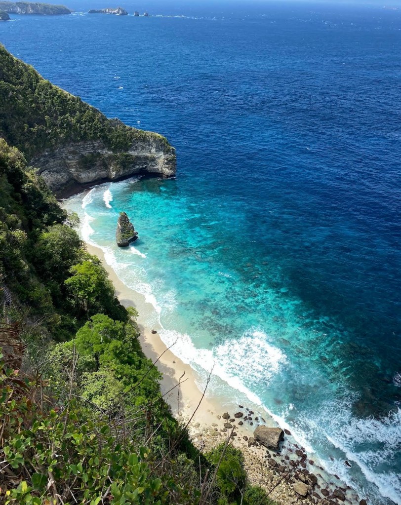 Pour y arriver, c’est déjà une petite aventure en soi. Depuis les routes principales de Nusa Penida, tu t’enfonces dans des chemins plus étroits, parfois un peu chaotiques, jusqu’à atteindre un point où la route s’arrête presque. À partir de là, soit tu continues à pied, soit tu prends une navette locale ou un scooter (si tu es très confiant dans ton équilibre et ton karma). Puis vient une marche dans la jungle, sur un sentier qui descend entre les arbres, les racines, et l’humidité dense typique de l’île. C’est déjà une expérience en soi avant même d’arriver à la plage.