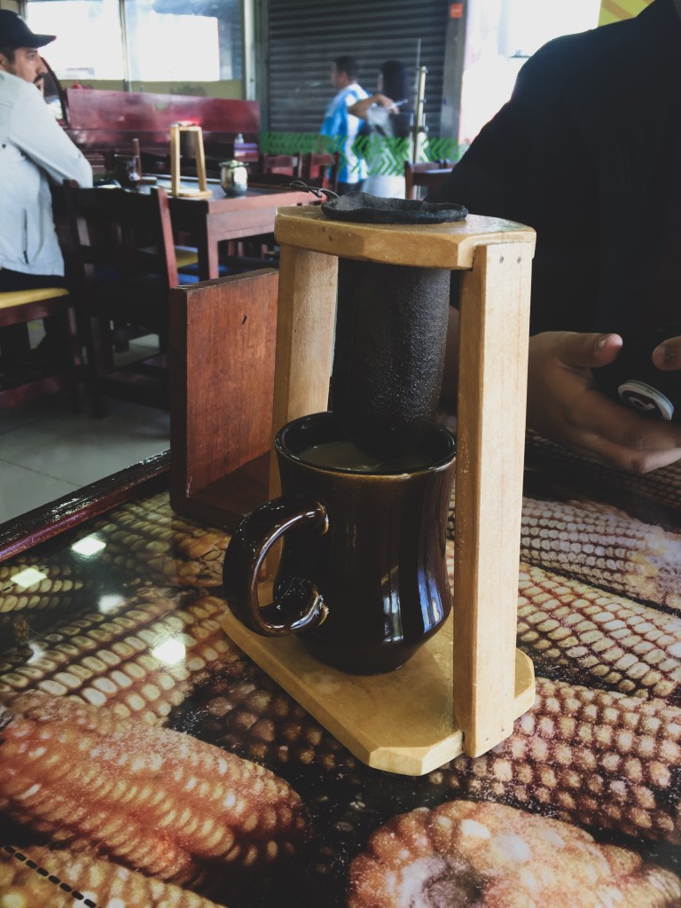 On m’a servi un café préparé avec une méthode traditionnelle, une sorte de petite poche en tissu suspendue sur un support en bois — le chorreador. Le café est versé lentement, goutte par goutte, presque comme un rituel. Rien de pressé. Rien d’industriel. Juste du temps, de la patience, et un respect du produit.